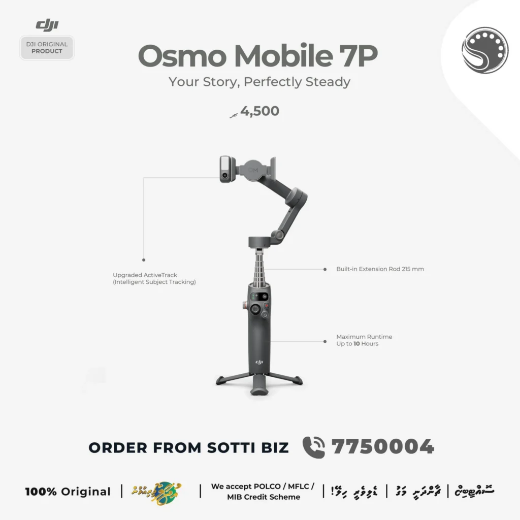 - Box Contents: DJI Osmo Mobile 7P gimbal, magnetic phone clamp, multifunctional module, built‑in tripod, USB‑C cable, phone charging/connection cables, storage pouch, user manual