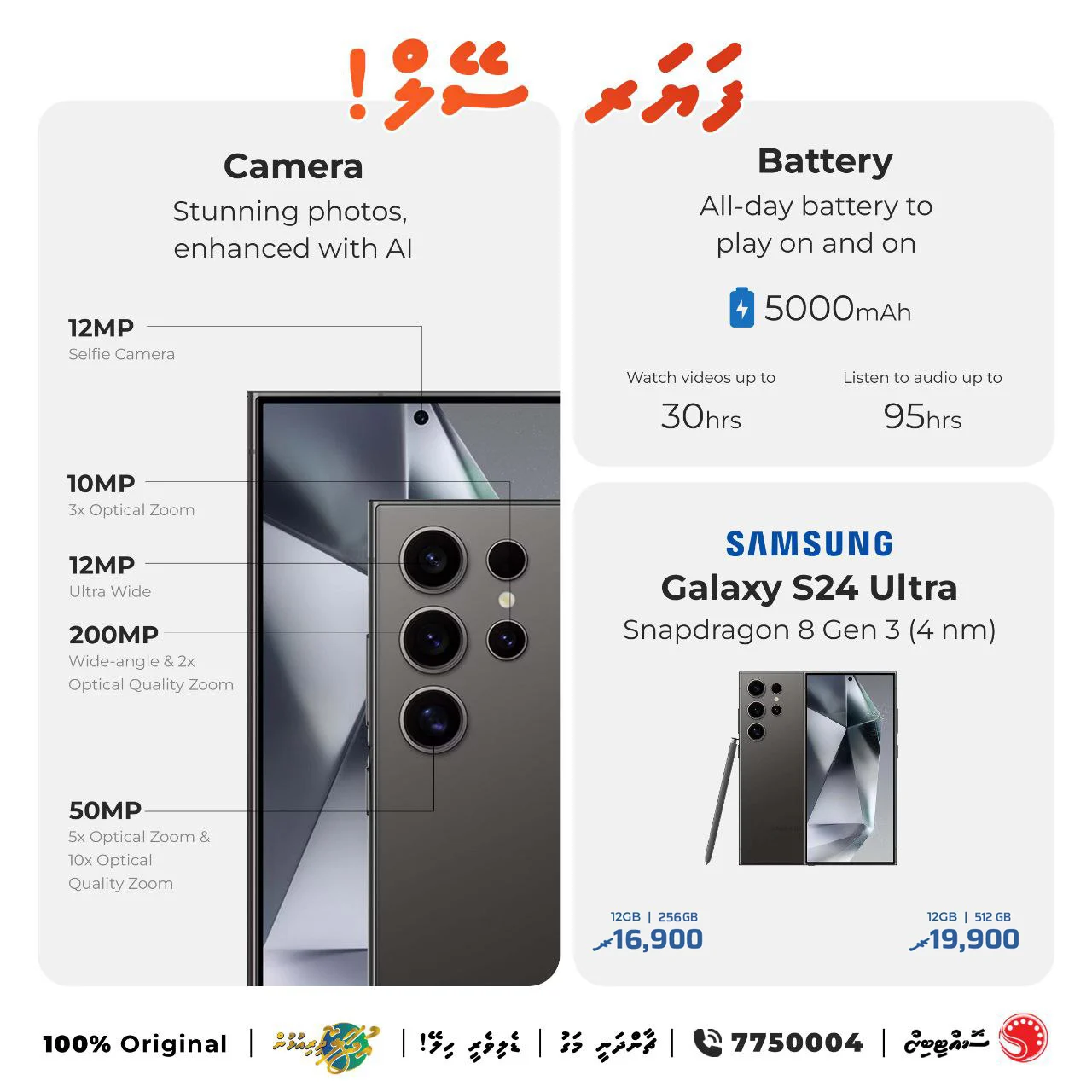 މި ޕްރޮމޯޝަންގެ ދަށުން، 12 ޖީބީ ރެމްގެ 256 ޖީބީގެ މެމޮރީ ހުންނަ އެސް 24 އަލްޓްރާ ފޯނެއް އެ ފިހާރައިން މިހާރު ވިއްކަމުންދަނީ 16،900 ރުފިޔާއަށެވެ.